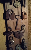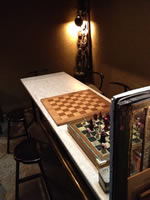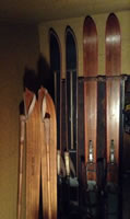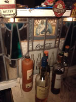 | 店の奥の少し隠れた場所には 長い大理石のカウンターがある。 ここはまた、数々のアンティークの鍵、古いスキー板、 ストック、登山道具等に囲まれ、 全く雰囲気の違う スペースになっている。 |