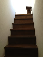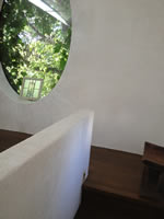 地下から2階へつながる階段を上がると 一転して明るく、 大きな楕円形の窓から木漏れ日が さんさんと降り注ぐ空間が現れる。 |