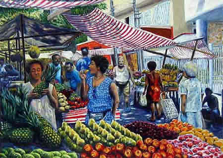 市場に並ぶ艶やかなトロピカルフルーツ。