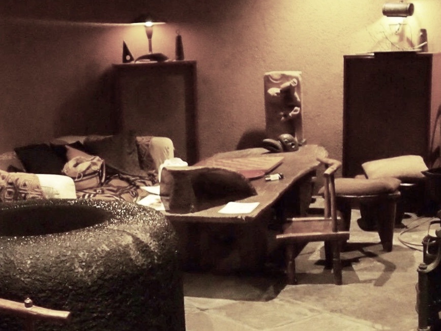 井戸の向こうにはアフリカのテーブルとタンノイのスピーカー
